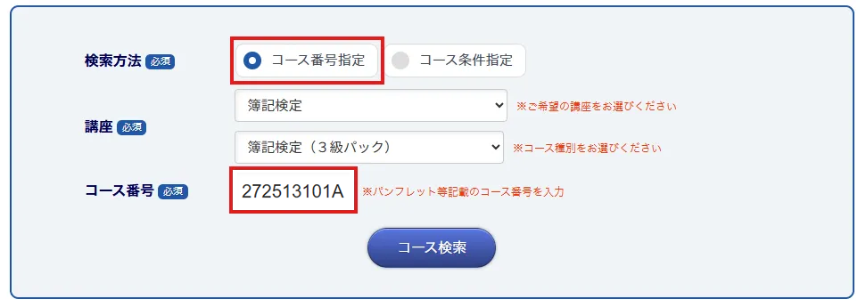 講座申し込みのフォームにて[コース番号指定]を選択し、講座を[簿記検定] [簿記検定(3級パック)]にしてコース番号[272513101A]をご入力ください。