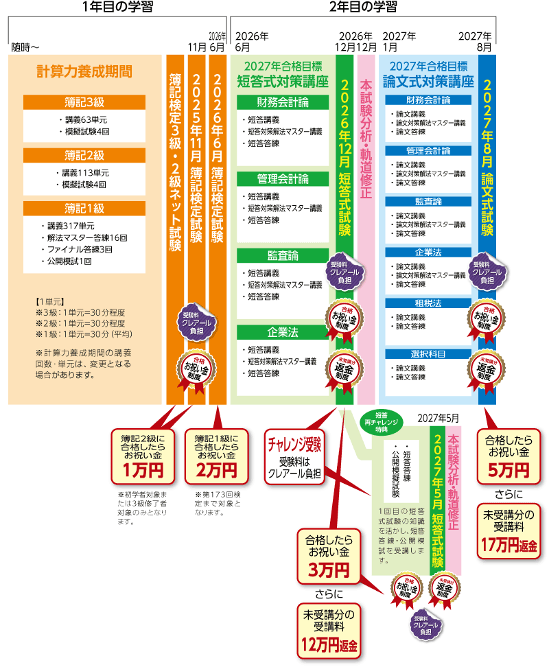 簿記2級(ネット試験含む)、2026年6月までの簿記1級、2026年12月から2028年8月の短答式・論文式試験に合格された方には、「合格お祝い金」を進呈いたします。お祝い金額等の詳細は、こちらをご覧ください。