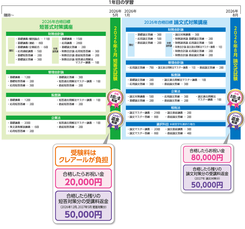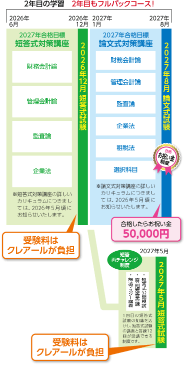 2026年8月の論文式試験を受験するコースですが、2026年8月の論文式試験が不測の結果となってしまっても2027年8月の試験も目指すことができる1年の保証がつくコースです。まずは2025年12月に実施される短答式試験の学習を中心に、2026年8月の論文式試験の合格を目指して学習を進めていきます。なお、2025年12月の短答式試験がもしもの結果となってしまっても2026年5月に実施される予定の短答式試験対策も受講できます。2026年8月の論文式試験が不合格の場合でも、追加料金なしで2027年8月の論文式試験を目指すことができます。また、本試験の受験費用もクレアール負担となり、早期合格でキャッシュバックの制度もありますので、経済的にも負担が少なくなっているコースです。