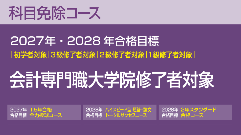 会計専門職大学院修了者対象 1.5年合格全力投球コース 簿記3級修了者対象 Web通信 |