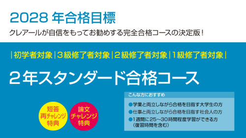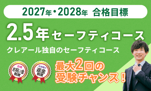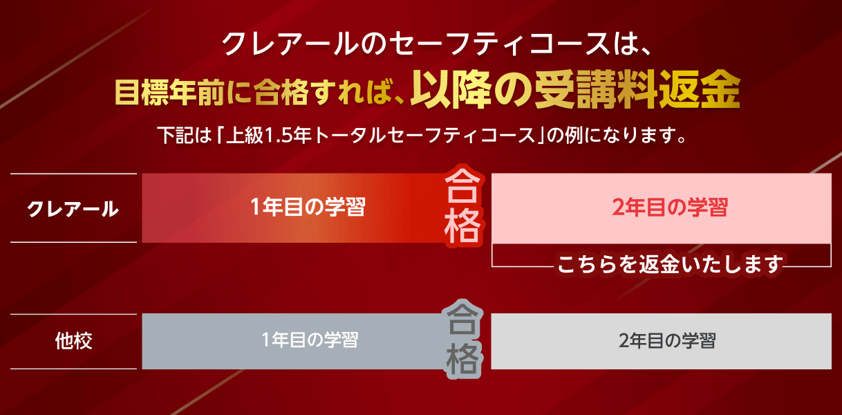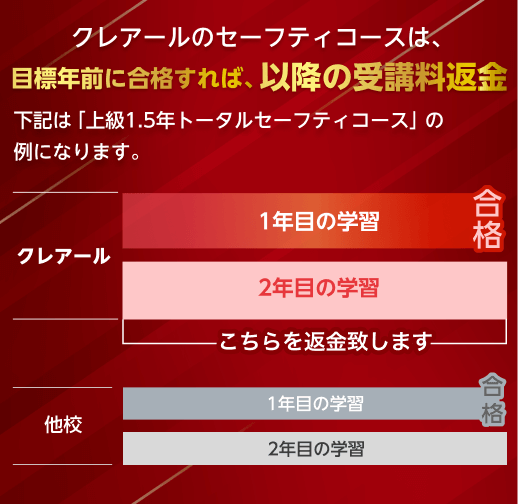 また、万が一の場合に備え、複数回の受験を可能にした「セーフティコース」の投入など、社会人でも安心して合格できるカリキュラムをご用意しています。クレアールでは働きながら合格を目指せる環境が整っています。