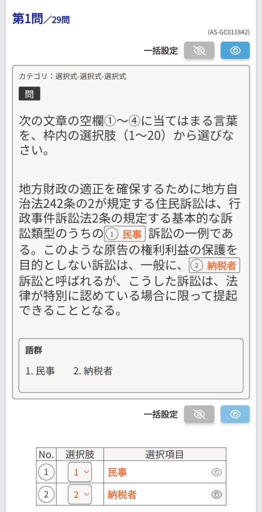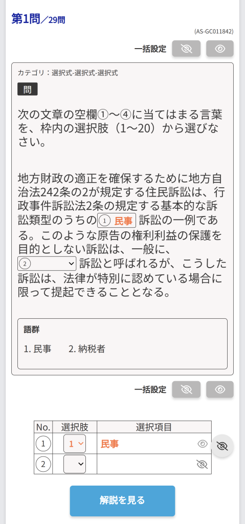 ②[ホーム]の画面から「正誤択一」「穴埋め」「暗記」のいずれかを選択します。問題選択画面で、旧ユーザータグで絞り込みます。
