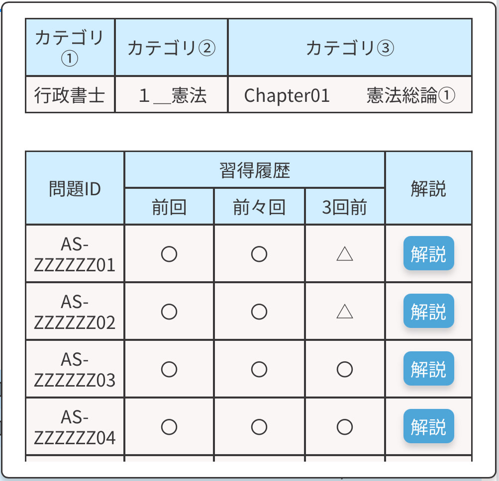 過去に解答した問題(すべてのカテゴリ)の中から定期的に「今のタイミングで再度挑戦したほうがよい問題」を10問選抜して、レコメンドする機能です。
