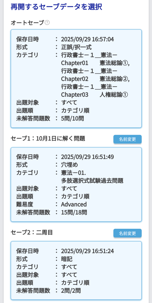 「保存日時」「形式」「カテゴリ」「出題対象」「出題順」「未解答問題数」が表示されます。
