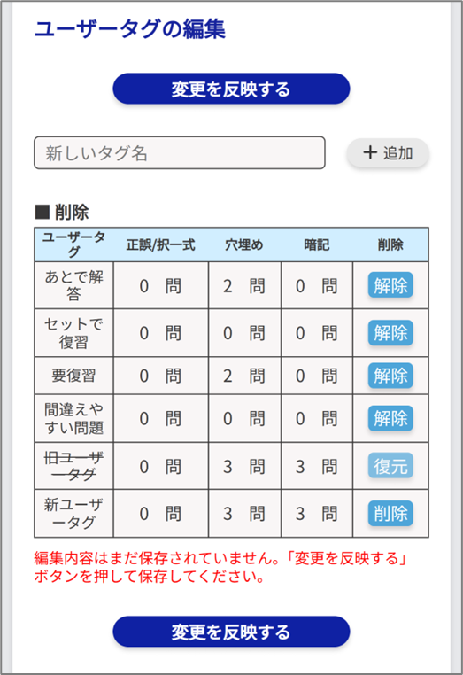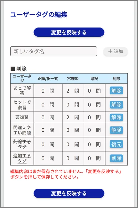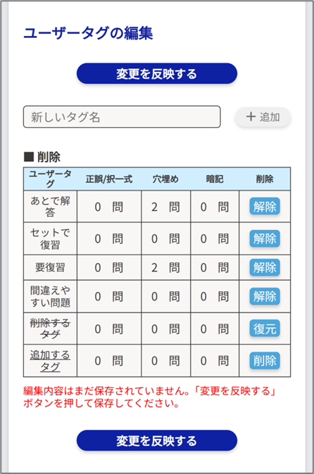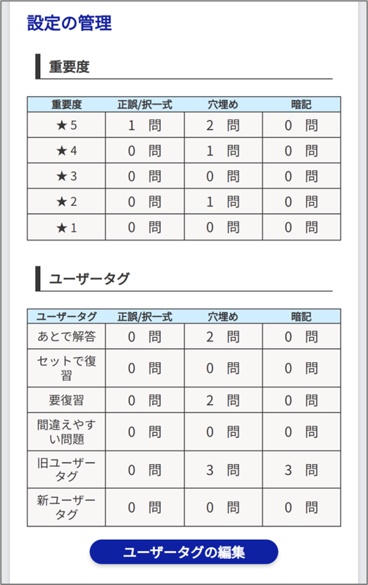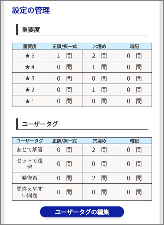 各重要度、各ユーザータグが設定されている問題数を確認することができます。