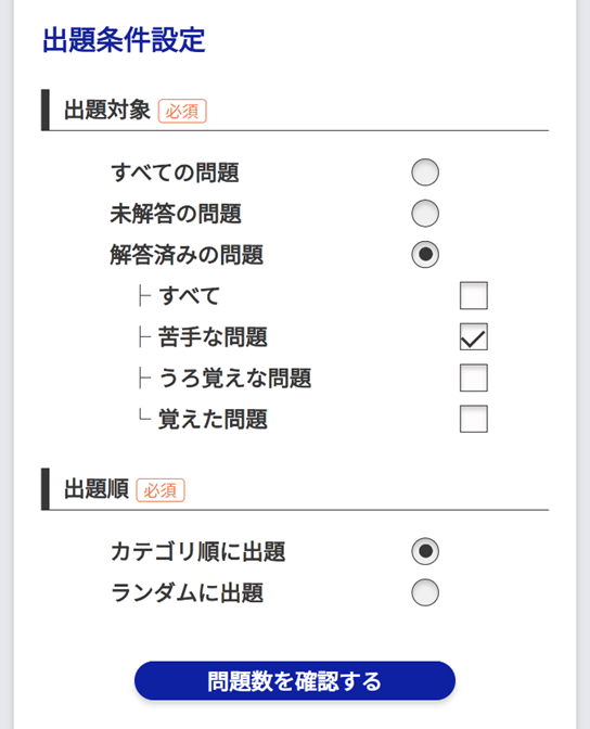 解答する問題を選択する際に、ユーザー設定条件において、メモの「ある・なし」にて出題対象を絞り込むことができます。