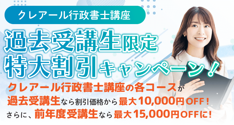 クレアール行政書士講座 受講生を対象に特別割引キャンペーンを実施します。特大割引を利用して、クレアールで合格を掴みませんか?