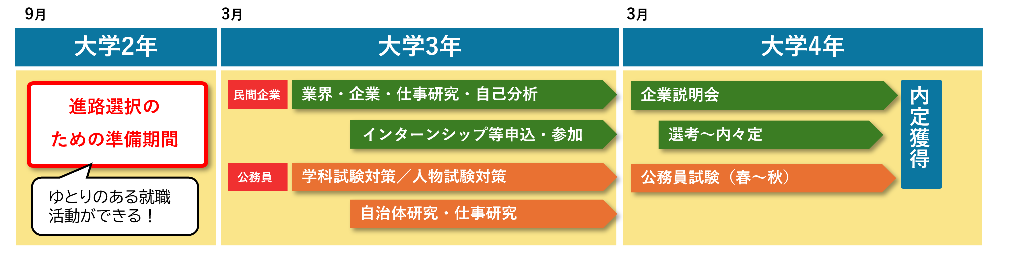 民間企業も公務員も、進路選択において欠かすことのできないのが情報収集です。イメージだけでなく、実際の業務内容や業界の動向、必要な対策などを調べる時間は少しでも多く確保しておくことがおすすめですが、3年生になってから着手するより、今のうちに少しずつ進めておくことで十分な時間をかけて情報を収集することができます。
