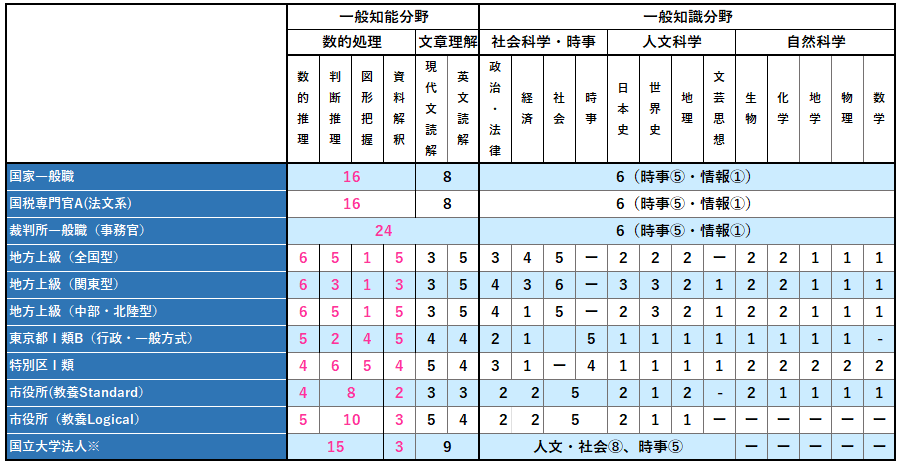 | 教養試験 | 市役所試験で最もよく行われる試験。数的処理、文章理解などの「一般知能分野」と、社会科学、自然科学、人文科学などの「一般知識分野」から出題される。 |