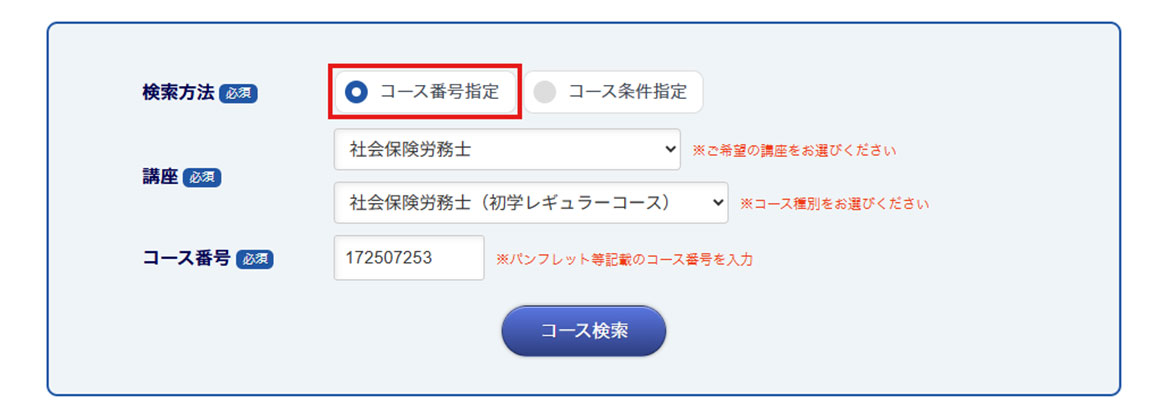 申し込みサイトで[コース番号指定]を選択し、講座の欄を[社労士]・[社労士初学者レギュラーコース]を選択したうえで上記のコース番号をご入力ください。