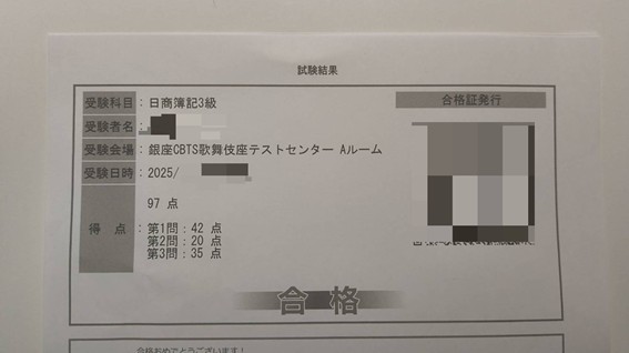 試験終了後、受付で試験結果が手渡されます。100点中70点以上が合格です。