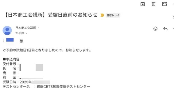 試験前日に確認メールが届きます。自宅から会場までのルート(会場がビルであれば階数まで)、所要時間は必ず確認しておきましょう。20分前には会場に着くことが理想です。