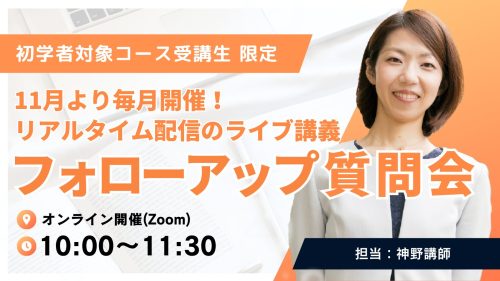 2026年度目標より、初学者コース受講生向けに、各月最低1回(11~5月)Zoomを用いてフォローアップ質問会を開催しております。神野講師が、事前質問への回答、科目別のミニ講義等も行います。