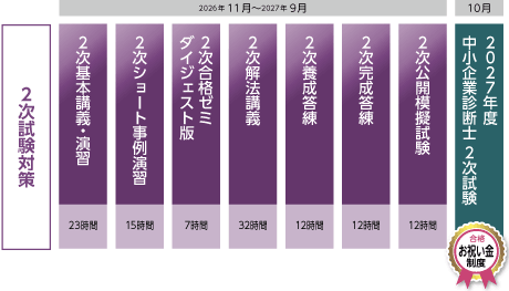 2026年は速修カリキュラムで(1次試験)科目合格を目指し、2027年で2次試験までの完全合格を目指すカリキュラムです。初年度は、2次試験との関連性が低く短期間に取得しやすい1次4科目(経済・情報・法務・中小)の合格を目指します。次年度は2次試験と直結する1次3科目(企経・運営・財務)と2次試験を並行して学習するため、双方の学習を効率的に進めることができます。また、2度の受験機会で学習負担が軽減されるため、忙しい中でも確実に合格を目指していただくことが可能です。