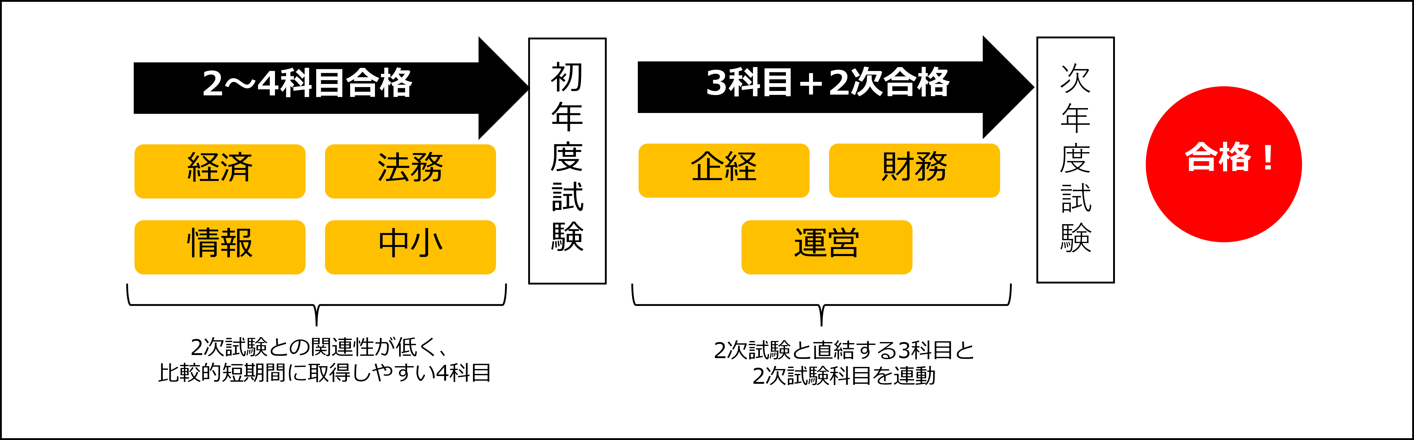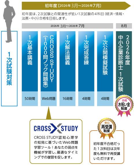 初年度は、2次試験との関連性が低い1次試験の4科目(経済学・経済政策、経営情報システム、経営法務、中小企業経営・政策)合格を目指します。