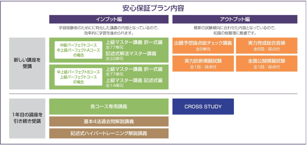 安心保証料金で受講期限が1年間延長され、これまで配信されていたインプット講座に加えて最新年度のアウトプットや中上級者プログラムも受講できます。