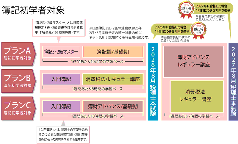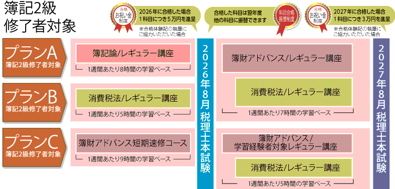 クレアール独自の講座である「簿記論」「財務諸表論」同時学習「簿財アドバンス」と実務上ニーズが高い税法科目である「消費税法」の3科目を、今から無理なく受験を可能にした講座が完成いたしました。簿記初学者の皆様から、受験経験者の皆様へ2026年、2027年の期間の中で、学習時間と学習経験から学習ペース、学習レベルに応じてコース選択できます。1年でも早く税理士を目指される方にとって、オススメです。限定コースになりますので、是非この機会をお見逃しなく!