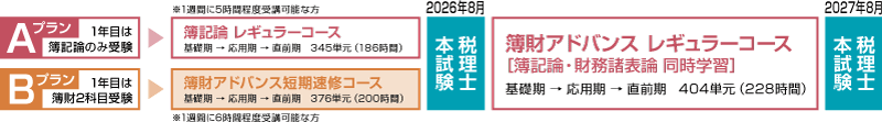 1年目の受講に関しては、簿記論レギュラーコースor簿財アドバンス短期速修コースを選べるので、ご希望の方は1年目から簿財2科目受験を目指せます。