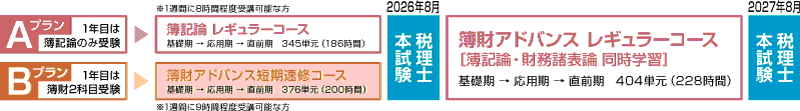 1年目の受講に関しては、簿記論レギュラーコースor簿財アドバンス短期速修コースを選べるので、ご希望の方は1年目から簿財2科目受験を目指せます。